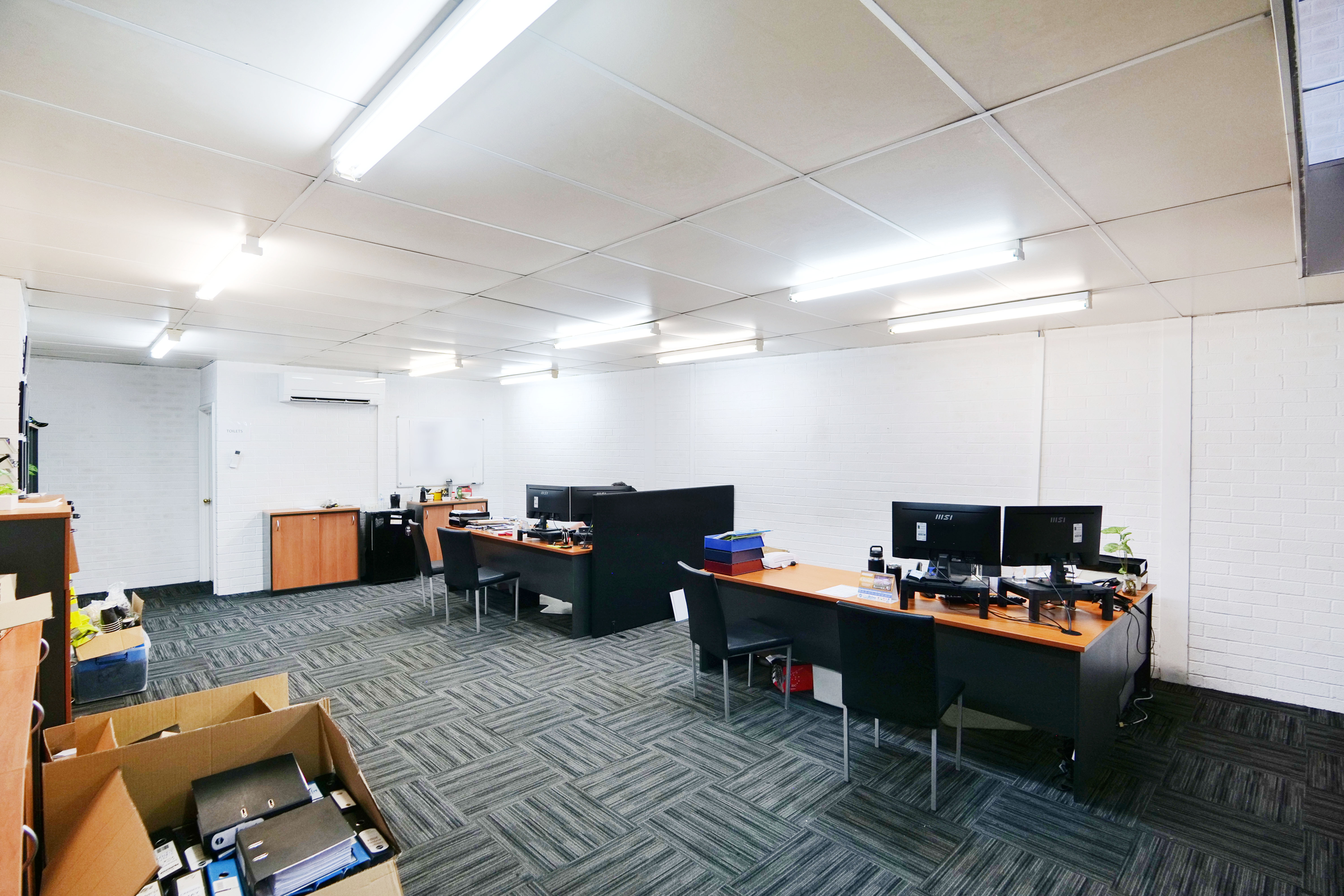 - Modern carpets, air conditioning and excellent lighting throughout office areas